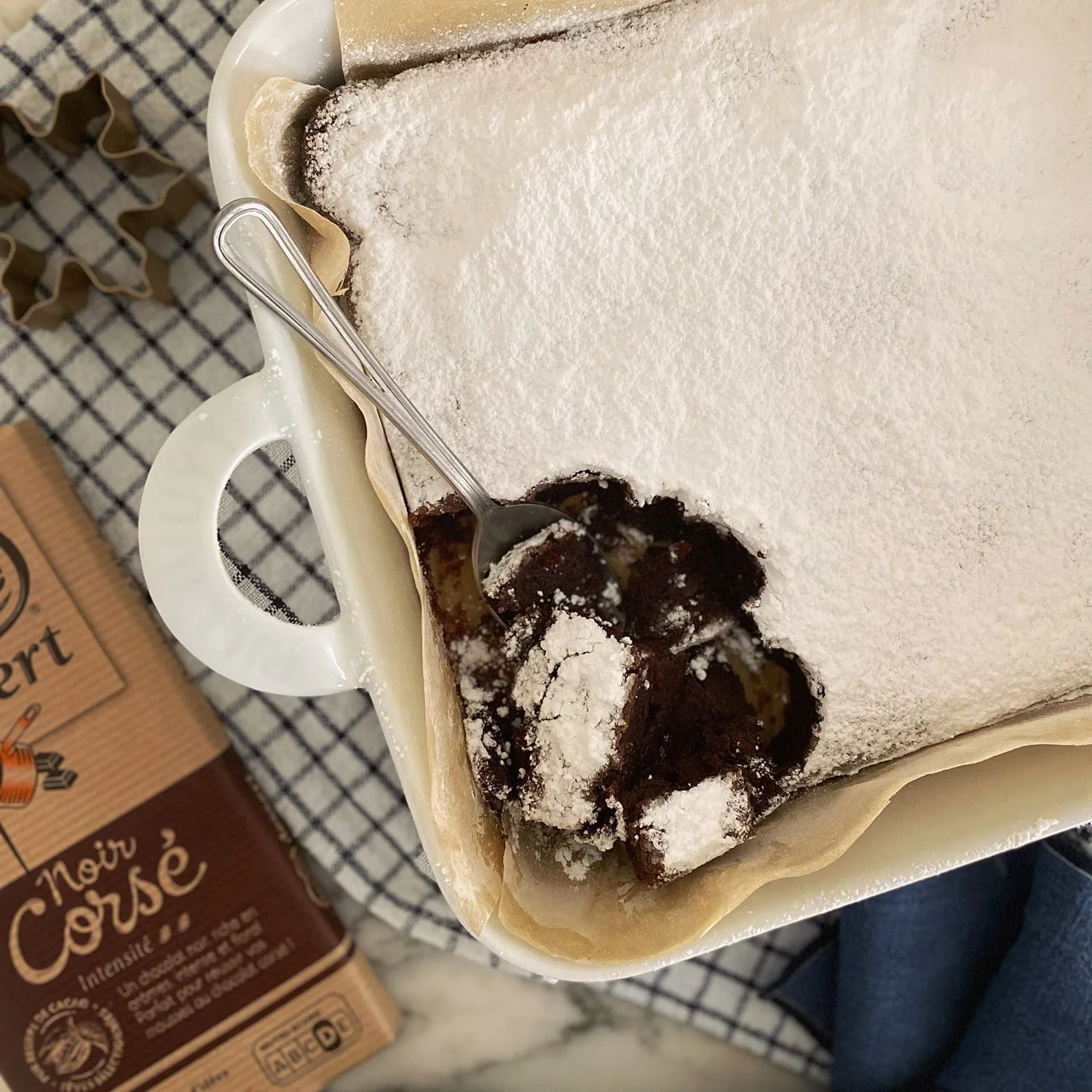 Je tapisse un moule à bords hauts avec du papier sulfurisé pour que le gâteau puisse être démoulé facilement après cuisson. Je verse la préparation dans le moule et je l’enfourne pendant 22 minutes à four chaud. Pour que le gâteau reste moelleux, il doit être en légère sous-cuisson au centre. Je sors alors le gâteau au chocolat et je le laisse refroidir avant de saupoudrer un peu de sucre en poudre sur le dessus.