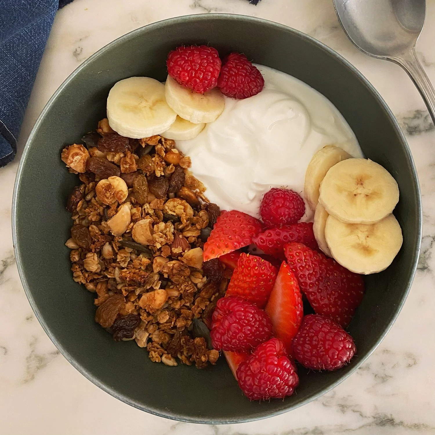 Dans un bol, je verse 120 g de yaourt végétal et le granola refroidi. Je coupe quelques fraises en deux ou en quatre, je tranche quelques rondelles de banane et j’ajoute les framboises fraiches.