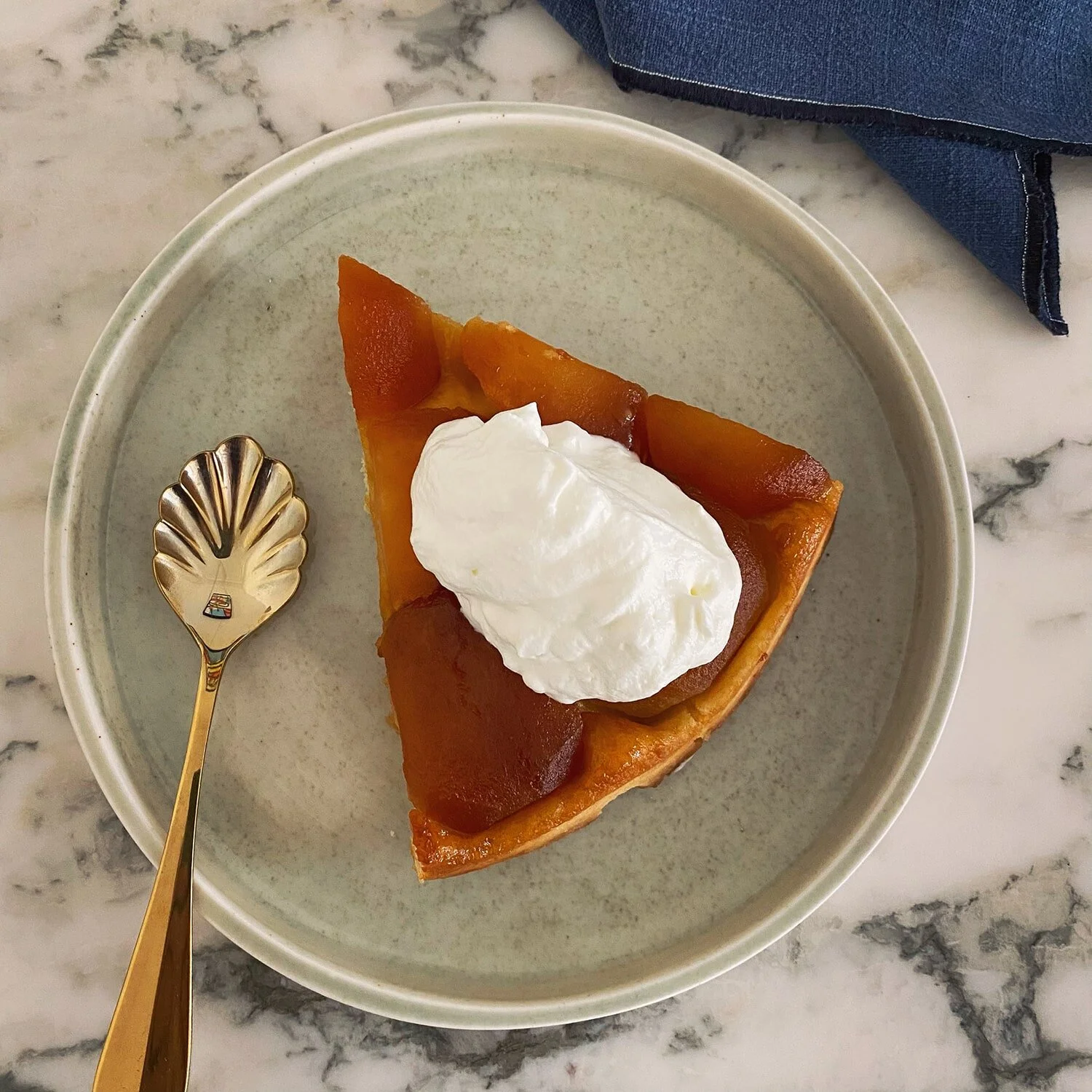 Je fouette la crème à l’aide d’un fouet électrique (si vous n’avez pas de fouet électrique vous pouvez utiliser un simple fouet et une bonne dose d’huile de coude). Je fouette la crème jusqu’à obtenir la texture d’une chantilly. Je dispose une grosse cuillerée de crème fouettée sur chaque part de tarte tatin.