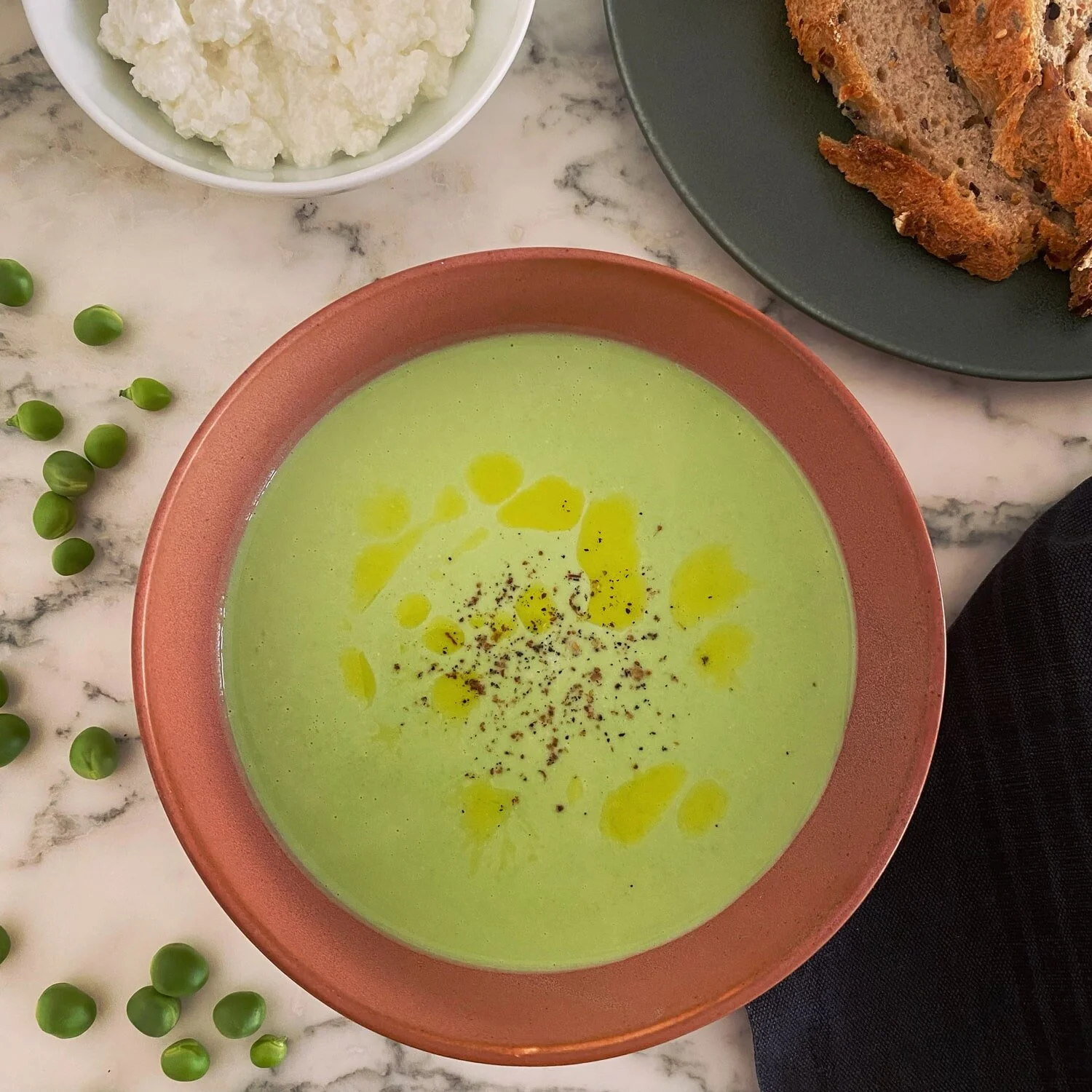 Je récupère les petits pois et je les mixe avec la ricotta à l’aide d’un bras mixeur ou d’un blender. La consistance doit être assez épaisse. Je viens la détendre en ajoutant progressivement quelques louches de bouillon, jusqu’à obtenir la consistance voulue.