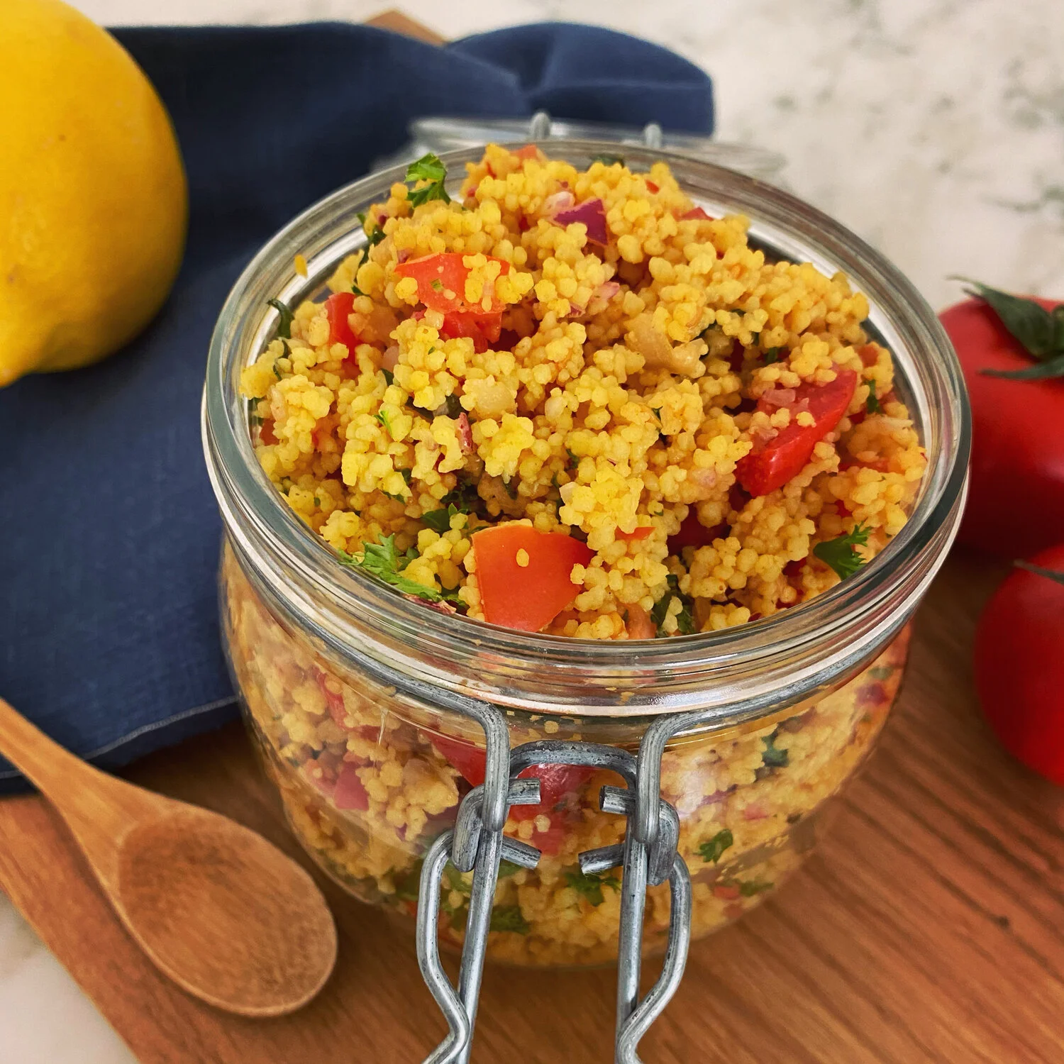 Ici, je vous propose sa version orientale (plus répandue au Maghreb), où le boulghour est remplacé par de la semoule de blé. Les puristes diront que cette variante n’a absolument rien à voir avec LE taboulé, qu’il s’agit en réalité d’une salade à la semoule, mais peu importe en réalité, tant que c’est bon…