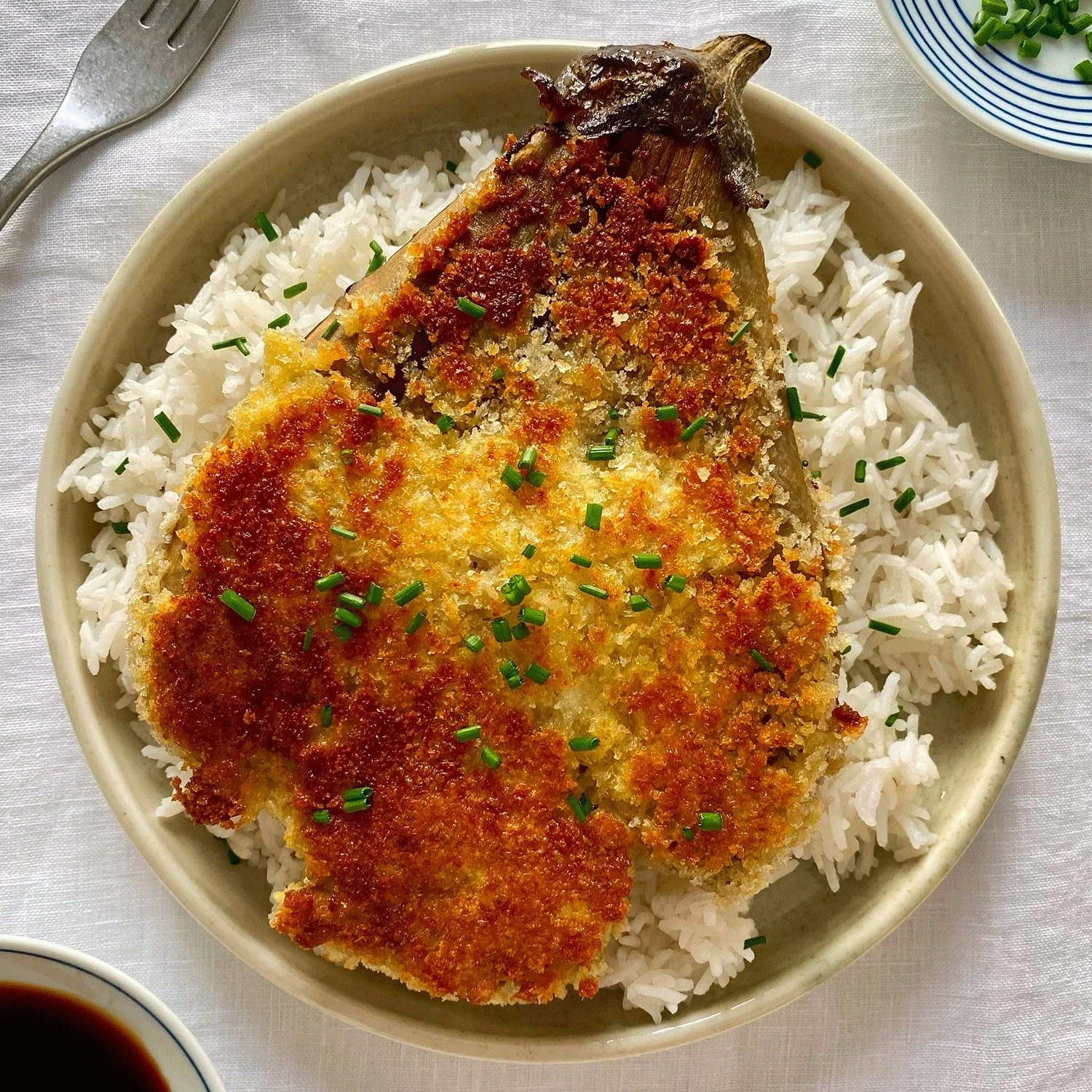 Je fais cuire l’aubergine panée dans une poêle préalablement huilée et chauffée à feu fort. Je retourne l’aubergine une fois que la croute du dessous est bien grillée. Je verse un peu de riz dans une assiette, et je dispose l’aubergine panée dessus. Je coupe quelques brins de ciboulette et je sers le plat d’aubergine avec un peu de sauce soja à côté.