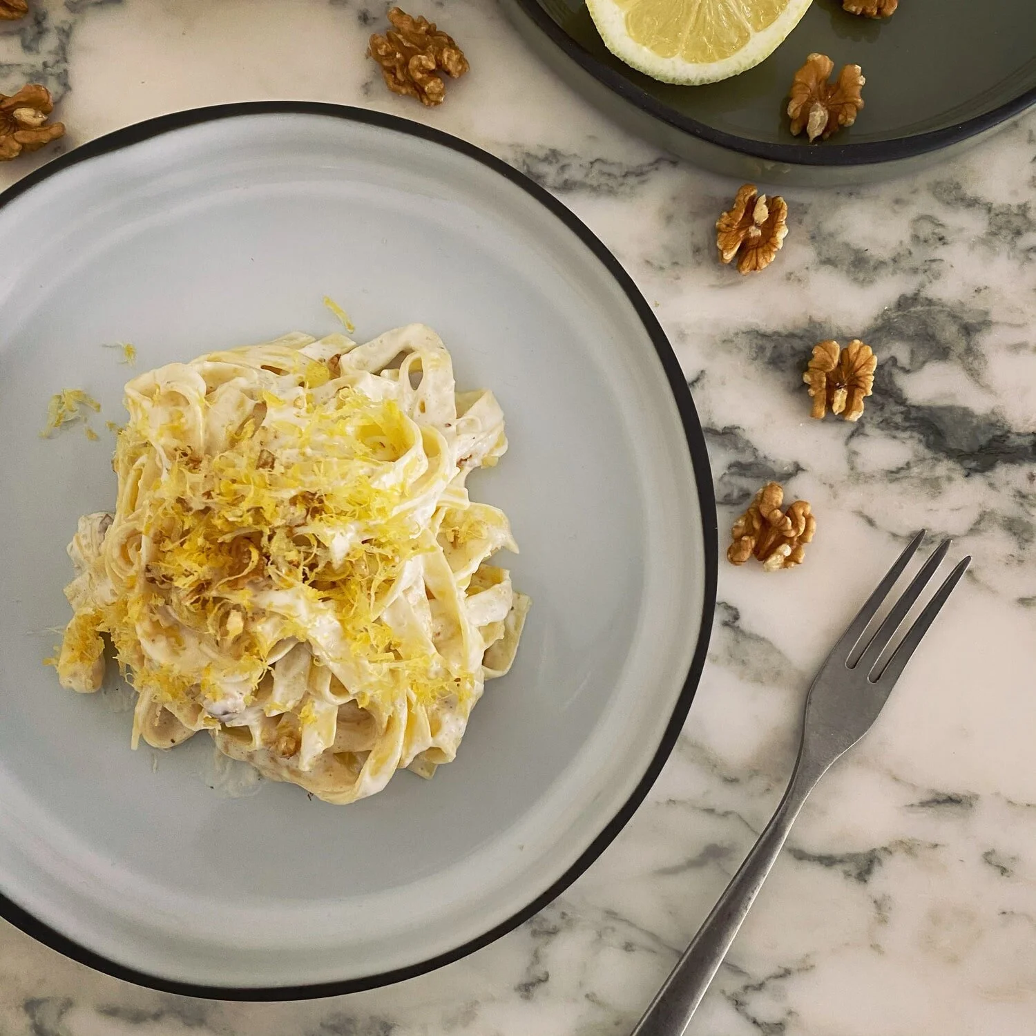 Enfin, ce que j’aime particulièrement, c’est que c’est ce qu’on appelle un “plat fond de tiroir” : pas difficile pour les moins prévoyants de dégainer à la dernière minute un citron qui traîne dans la corbeille de fruit (pas trop longtemps non plus sinon les zestes feront grise mine), un bocal rempli de noix, un pot de crème liquide longue conservation et un sachet de pâtes déjà entamé. Mais il va sans dire que le plat est meilleur avec des ingrédients frais. Alors si vous souhaitez épater la galerie à peu de frais et sans prise de tête, foncez ! Avanti !